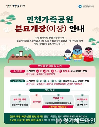 [경기헤드라인=문수철 기자] 인천광역시 종합건설본부는 인천가족공원을 시민들의 쾌적한 휴식공간으로 탈바꿈하기 위한 ‘인천가족공원 조성사업(3-2단계)’의 분묘 보상 및 개정절차를 본격적으로 시행한다고 밝혔다.