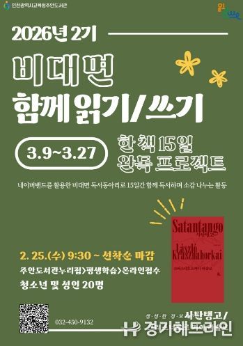 이번 프로그램은 정지선 독서지도 전문 강사의 안내에 따라 ‘사탄 탱고’를 함께 읽으며, 네이버 밴드를 활용해 감상평을 공유하고 한 권의 책을 15일간 완독하는 방식으로 3월 9일부터 27일까지 운영한다.