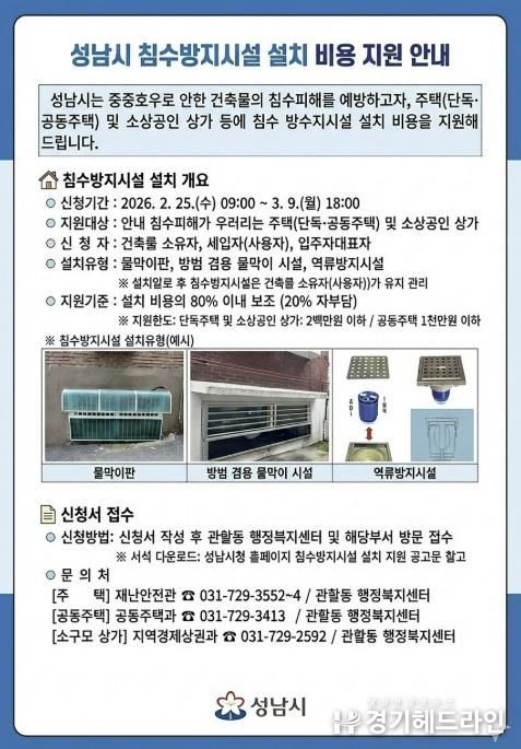 [경기헤드라인=문수철 기자] 성남시는 여름철 집중호우로 인한 주택과 상가의 침수 피해를 사전에 예방하기 위해 침수방지시설 설치 비용을 최대 80%까지 지원한다.