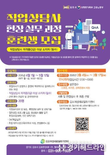 [경기헤드라인=문수철 기자] 김포여성새로일하기센터는 고용서비스의 질적 향상과 경력단절 예방을 위해 '직업상담사 현장실무 과정' 훈련생을 모집한다.