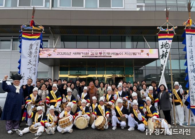 [경기헤드라인=문수철 기자] 김포교육지원청은 2026년 새해를 맞아 김포교육의 안녕과 번영을 기원하기 위해 지역의 김포통진두레놀이보존회와 함께 '2026년 새해기원 지신밟기' 행사를 진행했다.
