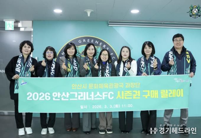 [경기헤드라인=문수철 기자] 안산시는 지난 3일 문화체육관광국 과장단이 안산그리너스FC(구단주 이민근) 2026시즌 시즌권 구매 릴레이에 동참하며 시민구단 응원 분위기 확산에 힘을 보탰다고 4일 밝혔다.