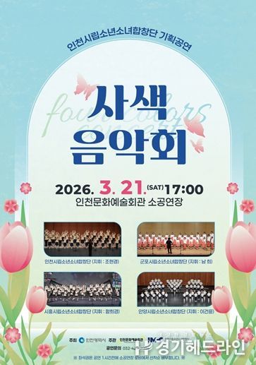 [경기헤드라인=문수철 기자] 인천시립소년소녀합창단(예술감독 조현경)이 오는 3월 21일 인천문화예술회관 소공연장에서 4개 도시의 목소리가 한데 어우러지는 특별한 교류연주 '사색음악회'를 개최한다.