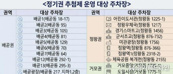 이번 추첨 대상 공영주차장은 배곧권의 배곧1~7호, 배곧12~13호, 배곧광장 10개소와 정왕권의 어린이도서관, 정왕우체국, 경기스마트고, 군서초교, 미관광장, 정왕역, 정왕역1, 체육공원 복개천 8개소, 거모권의 거모중앙, 도일시장 주차장 2개소를 포함하여 총 20개소다.