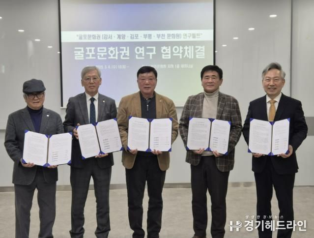 [경기헤드라인=문수철 기자] 부천문화원과 강서문화원, 계양문화원, 김포문화원, 부평문화원은 3월 4일 부천문화원에서 ‘굴포문화권’을 토대로 하는 연구교류 협약식을 체결했다. 이로써 ‘굴포’를 같은 문화권으로 하는 부천문화원·강서문화원·계양문화원·김포문화원·부평문화원은 학술대회와 콘텐츠 발굴 사업 등 다양한 지역학 자원을 발굴하고 활성화하기 위해 최초로 지역학 연구 모델을 구축하게 됐다. 특히, 이번 협약은 경기도(부천, 김포), 서울특별시(강서), 인천광역시(계양, 부평)를 잇는 ‘지역학’중심의 연구 교류를 마련한다는 점에서 주목된다.