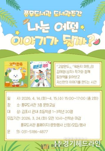 [경기헤드라인=문수철 기자] 김포시 풍무도서관은 오는 4월 14일부터 15일까지 총 2회에 걸쳐 어린이 프로그램 ‘나는 어떤 이야기가 될까?’를 운영한다.