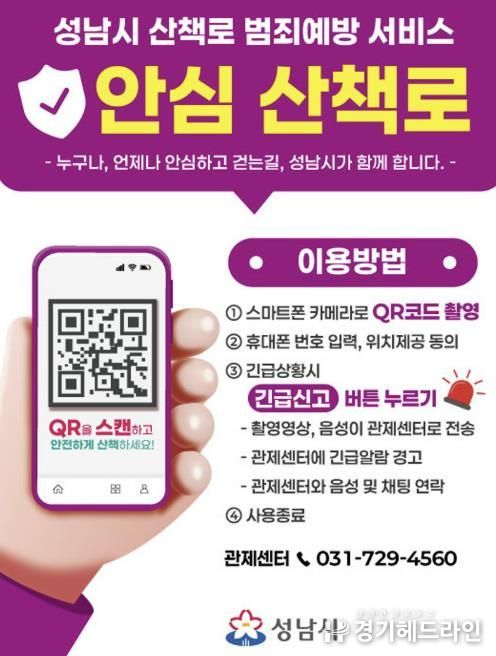 [경기헤드라인=문수철 기자] 성남시는 시민들이 보다 안심하고 산책로를 이용할 수 있도록 영장산과 불곡산 일대 산책로에 ‘범죄예방 서비스’를 6일부터 도입한다.