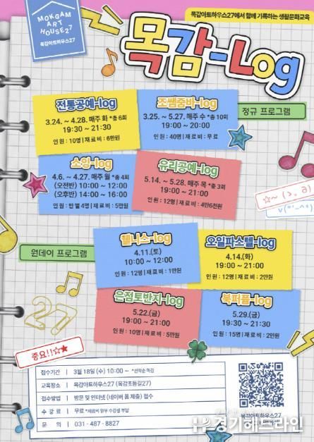 [경기헤드라인=문수철 기자] 시흥시는 목감아트하우스27에서 운영하는 상반기 생활문화교육 ‘목감-로그(log)’ 참여자를 모집한다.