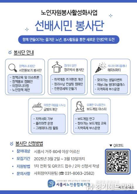 봉사단 인원은 총 10명을 선정할 계획으로, 모집 기간은 3월 13일까지다. 신청은 시흥시노인종합복지관 사회참여지원팀으로 전화하거나 홍보 포스터의 정보무늬(큐알코드)를 통해 하면 된다.