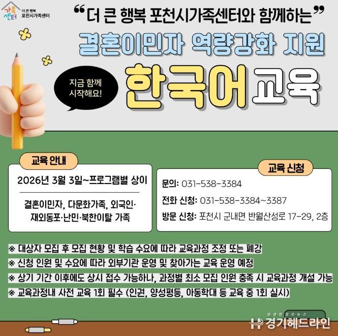 [경기헤드라인=김홍량 기자] 포천시 더 큰 행복 포천시가족센터는 2026년 결혼이민자 역량강화 지원 사업의 일환으로 한국어교육 과정을 수준별, 단계별 체계로 확대 개편하고 본격적인 운영에 들어갔다.