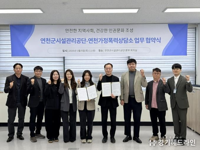 [경기헤드라인=김윤종 기자] 연천군시설관리공단은 가정폭력과 이로 인해 파생되는 아동학대 등 가정 내 폭력을 예방하고 피해자의 신속한 보호와 일상 회복을 실질적으로 지원하기 위해, 5일 연천가정폭력상담소와 '지역사회 폭력 예방 및 인권 증진을 위한 업무협약'을 체결했다고 밝혔다.