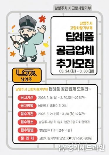 [경기헤드라인=문수철 기자] 남양주시는 오는 3월 24일부터 고향사랑기부제 참여자들에게 제공할 ‘2026년 고향사랑기부제 답례품 공급업체’ 추가 모집 접수를 시작한다고 6일 밝혔다.