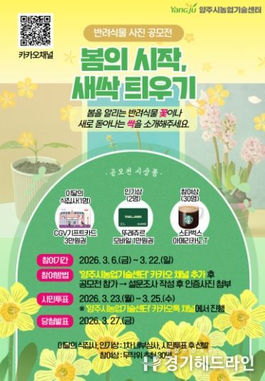 [경기헤드라인=김윤종 기자] 양주시가 시민과의 소통을 강화하고 도심 속 녹색 생활 실천 분위기를 조성하기 위해 ‘2026년 반려식물 사진 공모전’ 3월 이벤트를 개최한다.