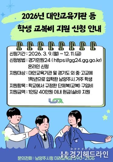 [경기헤드라인=문수철 기자] 남양주시는 대안교육기관 및 경기도 외 지역 중·고등학교에 입학하는 1학년 학생을 대상으로 교복비 지원사업을 추진한다고 9일 밝혔다.
