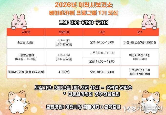 [경기헤드라인=정현수 기자] 이천시는 임산부 및 영유아 보호자를 대상으로 3월 23일 오전 10시부터 ‘2026년 베이비카페 프로그램 1기’ 참여자를 온라인 선착순으로 모집한다고 밝혔다.