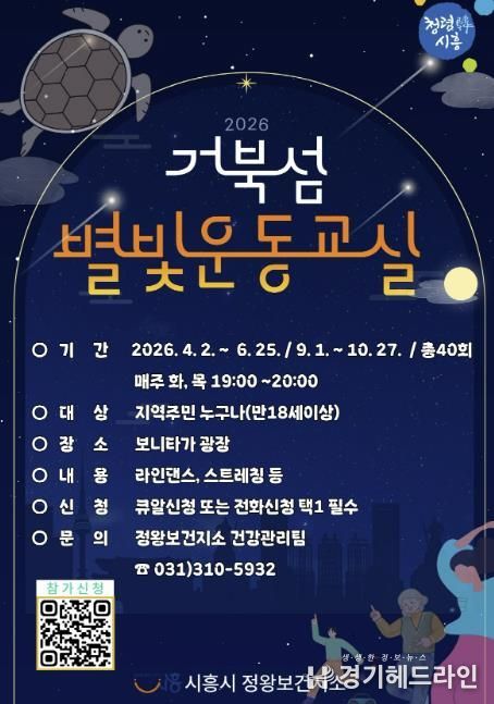 [경기헤드라인=문수철 기자] 시흥시는 지역주민의 신체활동 증진과 생활터 중심의 건강관리 지원을 위해 오는 4월 2일부터 거북섬동 보니타가 광장(MTV 3호광장)에서 ‘2026년 거북섬 별빛운동교실’을 운영한다.