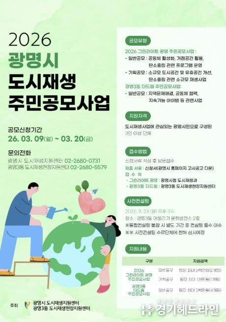 [경기헤드라인=문수철 기자] 광명시가 오는 20일까지 주민이 스스로 마을 문제를 해결하고 공동체 활성화를 이끌어갈 ‘2026년 도시재생 주민공모사업’ 참여단체를 모집한다.