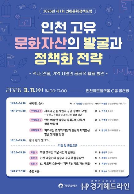 [경기헤드라인=문수철 기자] 인천문화재단은 오는 2026년 3월 11일 오후 2시부터 5시까지 인천아트플랫폼 C동 공연장에서 '2026년 제1회 인천문화정책포럼'을 개최한다.