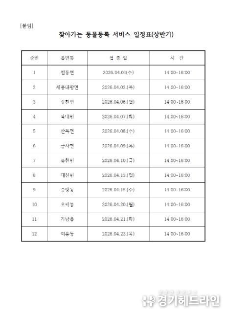 이번 서비스는 춘계 광견병 예방접종 기간에 맞춰 진행되며, 읍·면·동별 지정된 운영 일정(별첨)에 따라 행정복지센터 접수 창구를 방문해 신청서를 작성하면 된다. 동물등록은 외장형 무선식별장치를 부착하게 되며, 반려동물 소유주는 3,000원의 수수료를 납부하면 된다.