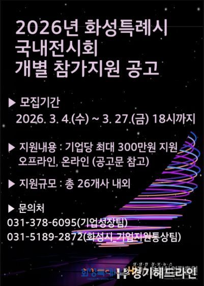 [경기헤드라인=문수철 기자] 화성산업진흥원은 관내 중소기업의 국내 판로 확대와 브랜드 인지도 제고를 위해 ‘2026년 화성시 국내 전시회 개별참가 지원사업’을 추진하고, 참여기업 26개사를 모집한다고 밝혔다.