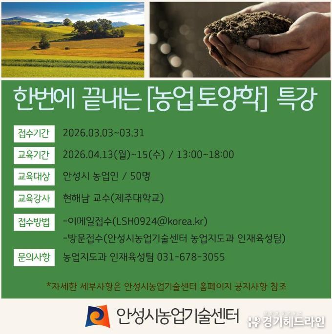 [경기헤드라인=문수철 기자] 안성시농업기술센터가 오는 31일까지 토양 분야 권위자인 제주대학교 현해남 교수를 초청해 ‘농업 토양학 특강’ 교육생을 모집한다.