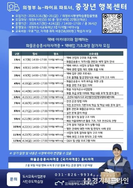 [경기헤드라인=문수철 기자] (재)의정부도시교육재단은 택배 전문 교육기관 택배아카데미와 협력하여, 중장년층의 새로운 도전을 지원하는'화물운송종사자격증+택배업 기초과정'참여자를 3월16일부터 모집한다고 밝혔다.