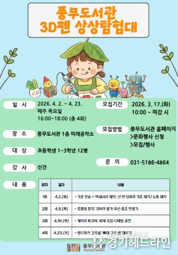 [경기헤드라인=문수철 기자] 김포시 풍무도서관은 초등학생 1~3학년을 대상으로 ‘3차원 펜 상상탐험대’를 오는 4월 2일부터 4월 23일까지 매주 목요일 오후 4시부터 6시까지 총 4회에 걸쳐 운영한다.