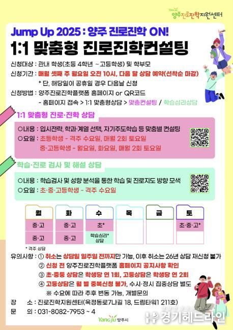 정유진 양주시 미래교육과장은 “학생들이 자신의 적성과 진로 방향을 충분히 탐색할 수 있도록 단기 상담에서 벗어나 상시 상담 체계를 구축했다”며 “앞으로도 학생과 학부모의 목소리를 반영해 실질적으로 체감할 수 있는 진로·진학 지원 서비스를 적극 확대해 나가겠다”고 말했다.
