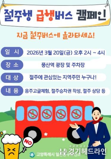 [경기헤드라인=김홍량 기자] 고양특례시 일산동구보건소는 건전한 음주문화 조성과 지역주민의 건강증진을 위해 오는 20일 오후 2시부터 4시까지‘절주행 급행버스 캠페인’을 운영한다.