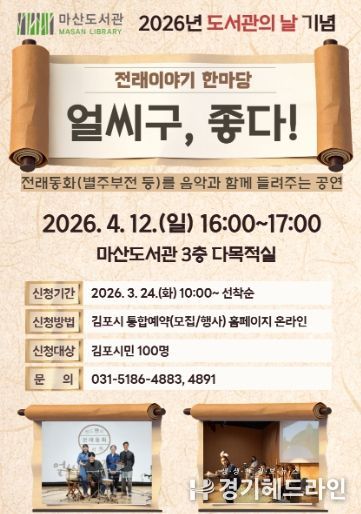 [경기헤드라인=문수철 기자] 김포시 마산도서관은 제4회 도서관의 날을 맞아 오는 4월 12일 오후 4시부터 5시까지 마산도서관 3층 다목적실에서 전래이야기 한마당 '얼씨구, 좋다!'를 운영한다.