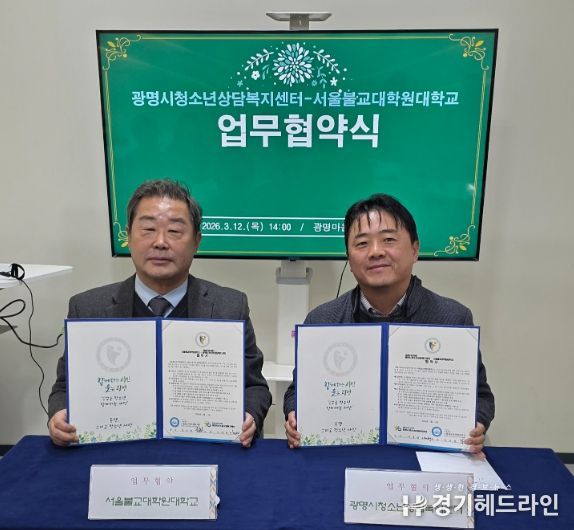 [경기헤드라인=문수철 기자] 광명시청소년재단 광명시청소년상담복지센터와 서울불교대학원대학교는 광명마음숲상담소에서 3월 12일 지역청소년의 심리·정서 지원 강화를 위한 업무협약(MOU)을 체결했다.