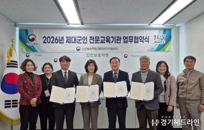 [경기헤드라인=문수철 기자] 국가보훈부 인천보훈지청 제대군인지원센터는 2026년 3월 13일 정부인천지방합동청사에서 사)대한민국항공보안협회 민간경비교육원 등 3개 교육기관과 2026년도 제대군인 전문위탁교육 업무협약을 체결했다.