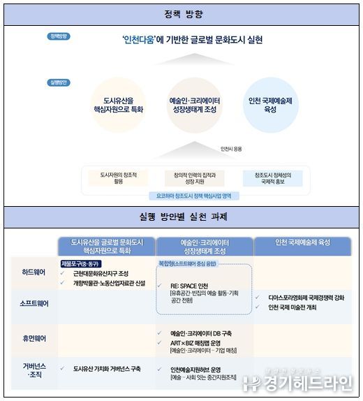 그리고 이러한 방향성 속에서 근현대 문화유산지구 조성, 인천개항도시박물관 및 인천노동산업자료관 신설, 도시유산 가치화 거버넌스 구축, 유휴공간의 예술적 전환, 예술인・크리에이터 DB 구축, 예술과 비즈니스를 연계한 ART×BIZ 매칭랩 운영, 인천예술지원허브 운영, 디아스포라영화제 국제 경쟁력 강화, 인천 국제 미술전 개최 등의 실천 과제를 제안했다.