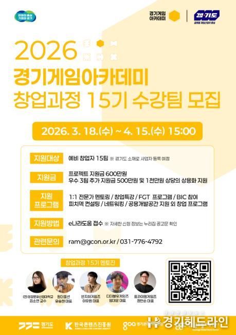 [경기헤드라인=문수철 기자] 경기도와 경기콘텐츠진흥원이 대한민국 게임산업의 미래를 이끌어갈 ‘2026 경기게임아카데미’ 창업과정 15기 수강생을 4월 15일까지 모집한다.