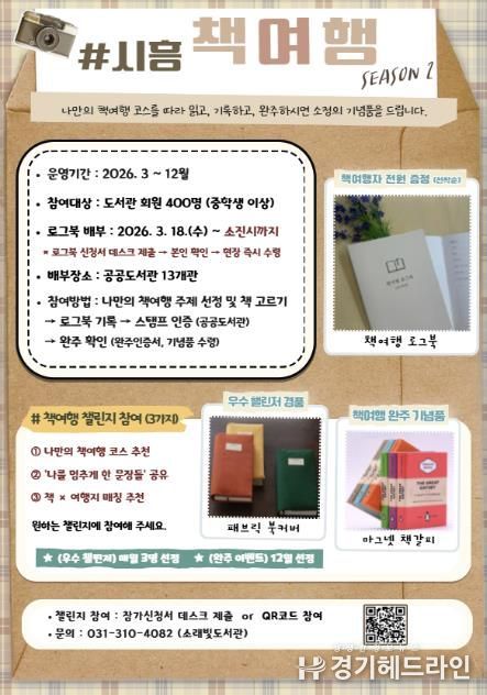 [경기헤드라인=문수철 기자] 시흥시도서관은 시민의 독서 실천을 지원하고 일상 속 독서문화를 확산하기 위해 3월 18일부터 ‘2026 시흥 책여행(시즌2)’ 로그북을 배부하고, ‘책여행 로그북 챌린지’를 함께 운영한다.