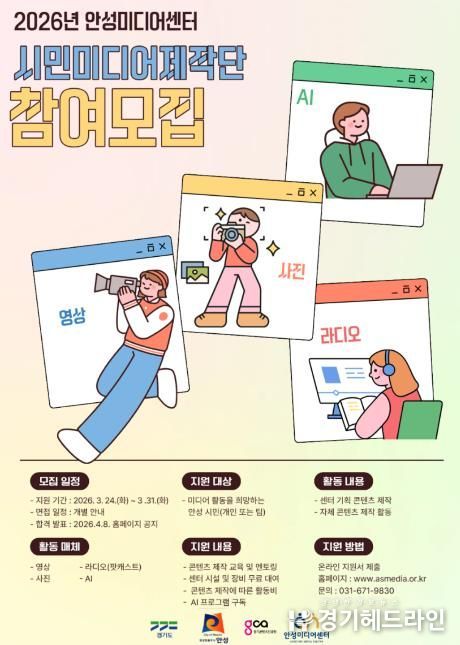 [경기헤드라인=문수철 기자] 안성시 미디어센터는 시민과 지역 모임(단체)의 미디어 콘텐츠 제작 활동을 지원하는 ‘시민미디어제작단’ 사업 참여자를 오는 3월 31일까지 모집한다.