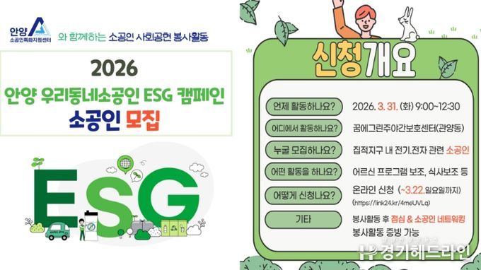 [경기헤드라인=문수철 기자] 안양산업진흥원은 오는 22일까지 소공인지원센터의 소공인 사회공헌 프로그램인 ‘2026 안양 우리동네소공인 ESG 캠페인’에 참여할 관내 소공인을 모집한다고 18일 밝혔다.