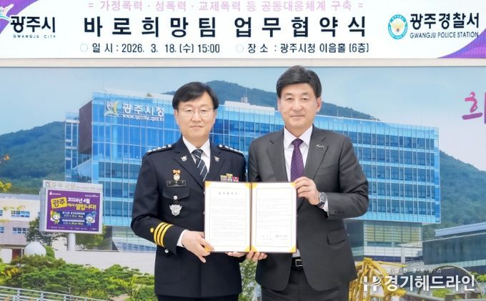 [경기헤드라인=정현수 기자] 광주시는 18일 시청 이음홀에서 광주경찰서와 가정폭력·성폭력·교제 폭력 등 폭력 피해자에 대한 공동 대응을 위해 ‘바로희망팀’ 업무협약을 체결했다.