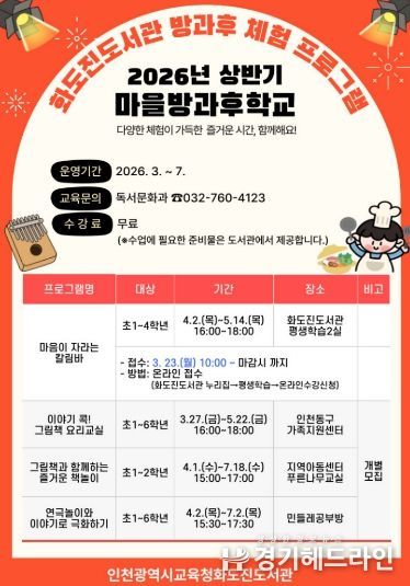 [경기헤드라인=문수철 기자] 인천광역시교육청화도진도서관은 3월부터 7월까지 초등학생을 대상으로 ‘2026학년도 상반기 마을방과후학교’프로그램을 운영한다.