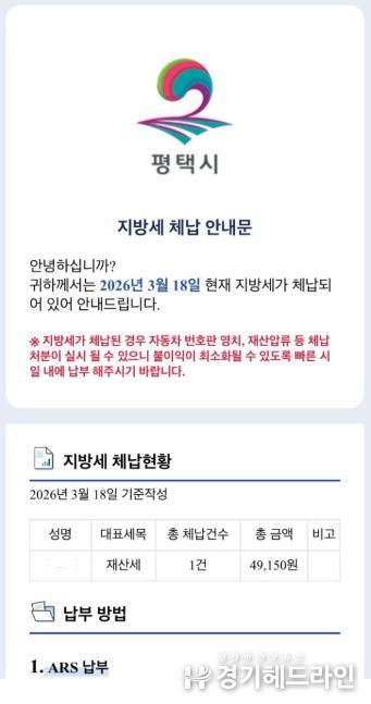 [경기헤드라인=문수철 기자] 평택시는 ‘모바일 전자고지 시스템’을 활용해 지방세 체납자 1만7천여 명을 대상으로 오는 23일과 24일 이틀 동안 전자문서 형태의 체납안내문을 발송할 예정이다.