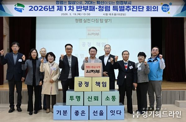[경기헤드라인=문수철 기자] 의정부시는 3월 19일 시청 태조홀에서 시장을 비롯해 부시장, 국·소 및 권역국장, 부서장 등 간부 공무원 87명이 참석한 가운데 ‘반부패·청렴 특별추진단 회의’를 열고 ‘기분 좋은 선’ 청렴 실천 공동 선언과 함께 2026년 반부패·청렴도 향상 종합 추진계획을 공유했다.