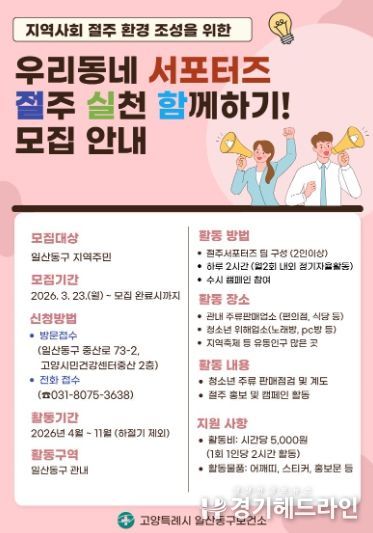 [경기헤드라인=김홍량 기자] 고양특례시 일산동구보건소는 건전한 음주문화 확산과 절주 실천 분위기 조성을 위한 ‘우리동네 서포터즈’의 참가자를 오는 3월 23일부터 모집한다.