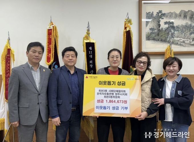 [경기헤드라인=김윤종 기자] 양주시 회천3동은 지난 17일 자유총연맹 양주시지회 회천3동 위원회와 사회단체협의회가 행정복지센터를 방문해 이웃 사랑 성금 약 180만 원을 전달했다고 밝혔다.