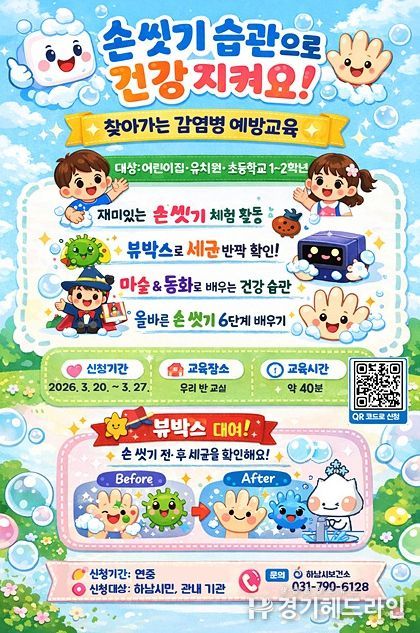 [경기헤드라인=문수철 기자] 하남시보건소는 오는 4월 6일부터 10월 2일까지 관내 어린이 대상 ‘손 씻기 교육’을 운영하며, 3월 20일부터 27일까지 관내 교육기관을 대상으로 네이버 폼을 통해 교육 신청을 받는다고 밝혔다.