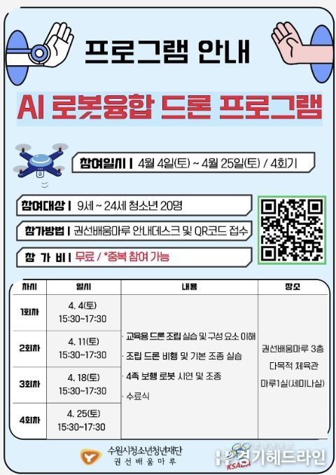[경기헤드라인=문수철 기자] 수원시청소년청년재단 권선배움마루는 오는 4월 청소년을 대상으로 AI 로봇융합 드론 프로그램을 운영할 계획이다. 이번 프로그램은 이론과 실습을 병행한 교육으로 구성되어 미래기술에 대한 이해를 높이고 디지털 역량을 강화하는 데 목적이 있다.