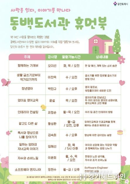 [경기헤드라인=문수철 기자] 용인특례시 동백도서관은 오는 4월 1일부터 ‘휴먼북’ 프로그램을 정비해 본격 운영한다고 23일 밝혔다.