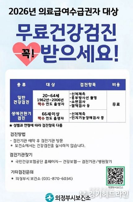[경기헤드라인=문수철 기자] 의정부시 보건소는 의료급여수급권자 및 건강보험가입자의 질병 조기 발견과 건강관리를 위해 2026년 국가 일반건강검진을 실시한다.