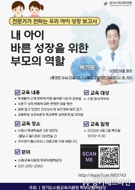 수원교육지원청은 “이번 특강을 통해 학부모들이 자녀의 발달단계에 맞는 올바른 교육법을 습득하고, 과학적 근거에 기반한 올바른 건강 정보를 얻어 자녀의 성장을 지원하는 선순환 구조가 구축되기를 기대한다”고 밝혔다.