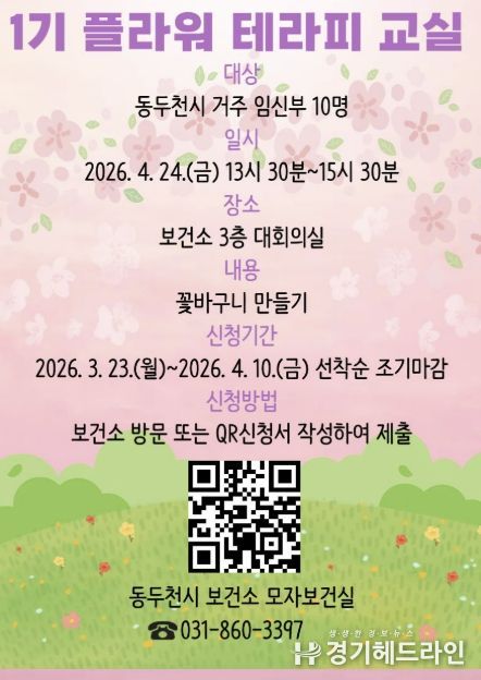 이번 플라워테라피 태교 교실은 4월 24일 보건소 3층 대회의실에서 진행하며 신청 기간은 오는 10일까지로 동두천시 보건소에 등록된 임신부를 선착순 모집한다.