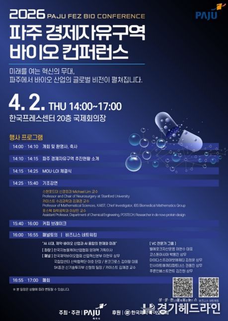 [경기헤드라인=김홍량 기자] 파주시는 오는 4월 2일 14시, 서울 중구 한국프레스센터 국제회의장에서 녪파주 경제자유구역 바이오 컨퍼런스’를 개최한다.